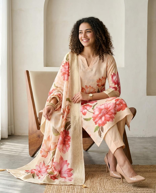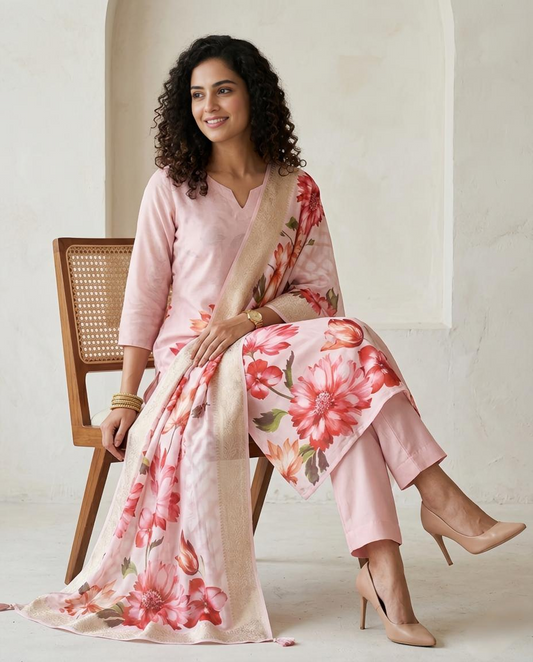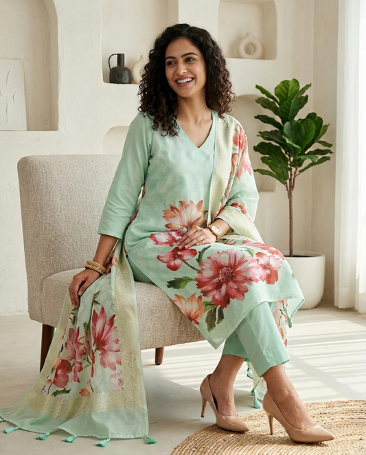 Premium Floral Print Banarasi Chanderi Unstitched Suit Set with Zari Border Dupatta
