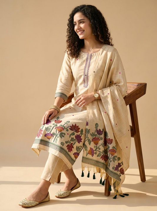 Premium Hand Kantha Embroidered Unstitched Linen Suit Set