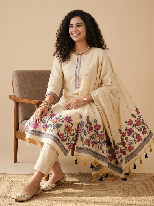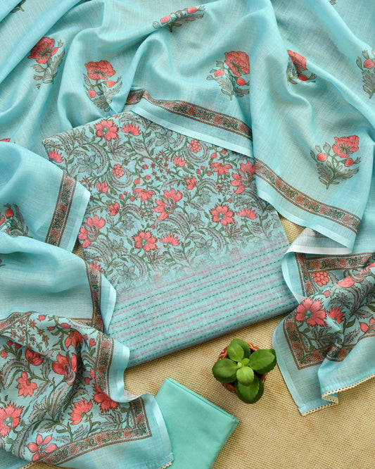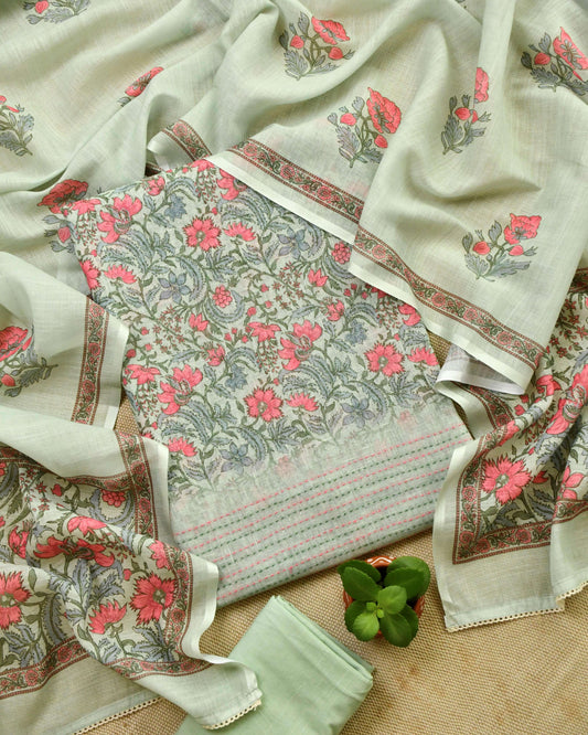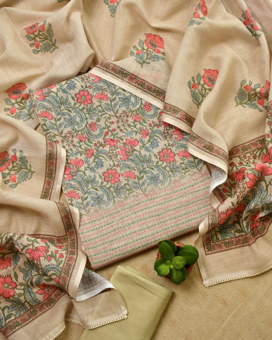 Premium Linen Floral Unstitched Suit Set with Hand-Block Prints & Kantha Work