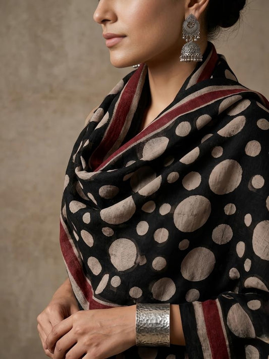Hand-Block Printed Pure Linen Stole - Black & Beige Polka Dot with Madder Red Border