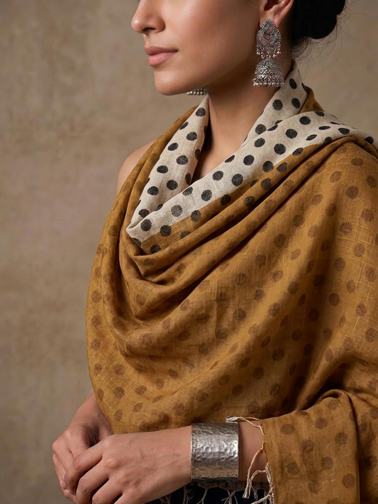Hand-Block Mustard & Cream Linen Stole – Dual-Tone Polka Dot Summer Stole with Tassels