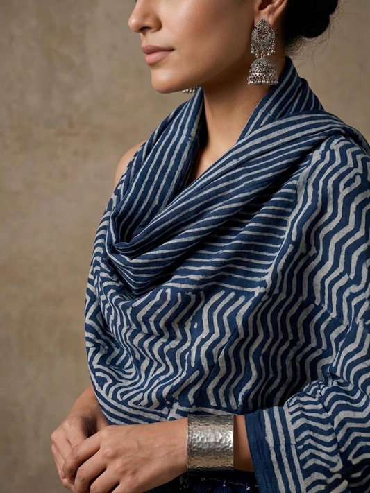 Indigo Blue Hand Block Printed Cotton Stole - Artisan Dabu Print Scarf with Tassels