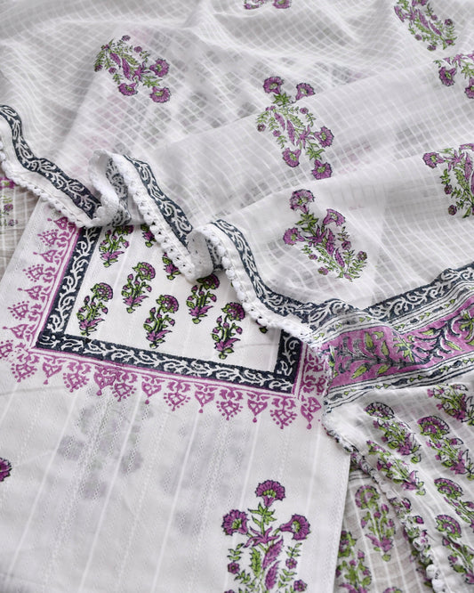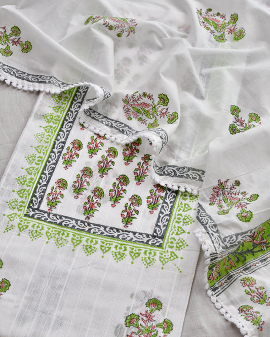 Pure Mulmul Cotton Unstitched Suit Set with Elegant Floral Hand-Block Prints