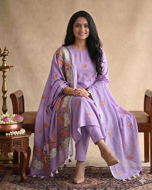 Pure Linen Unstitched Suit Set with Embroidered Pichwai Art