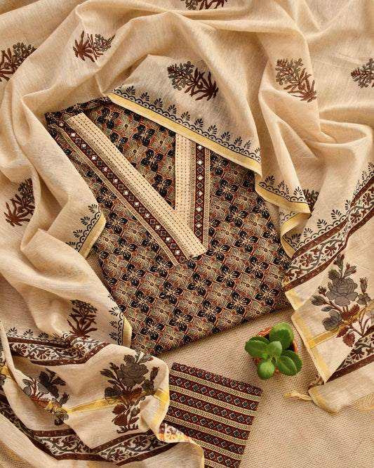 Premium Cotton Ajrakh Handblock Unstitched Suit with Kantha & Mirror Work