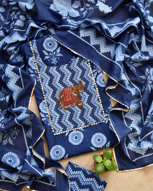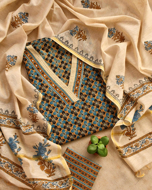 Artisanal Hand-Block Print Cotton Unstitched Suit Set with Embroidery