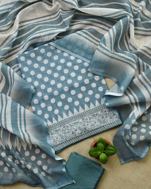Artisanal Schiffli Embroidered Cotton Linen Unstitched Suit Set