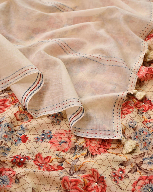 Khadi Linen Unstitched Suit with Hand-Embroidered Floral Neckline & Digital Print Dupatta