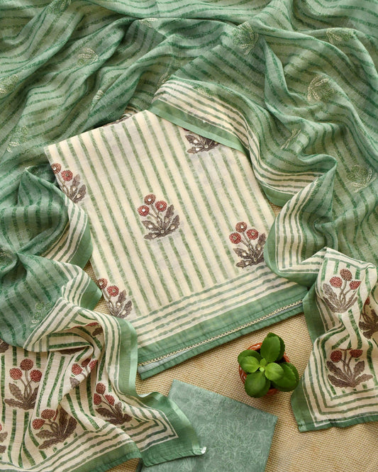 Pure Mulmul Cotton Unstitched Suit Set with Elegant Floral Hand-Block Prints