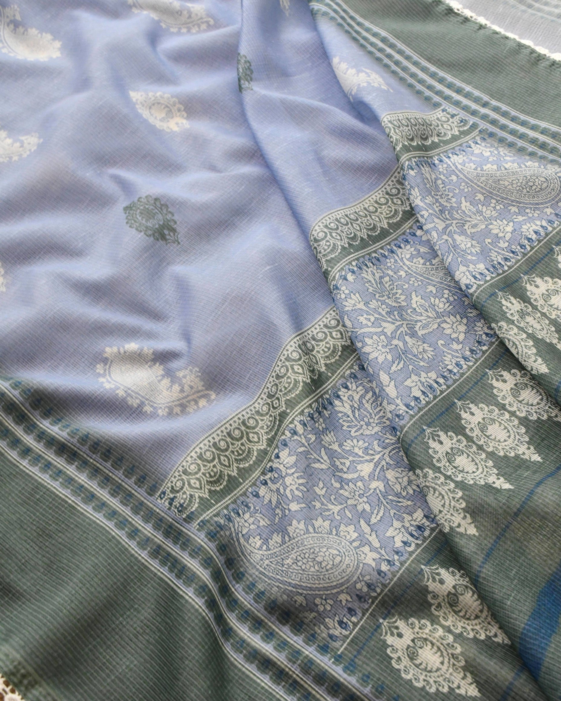 Designer Kota Doria Unstitched Suit Set – Floral Block Print with Elegant Crochet Lace