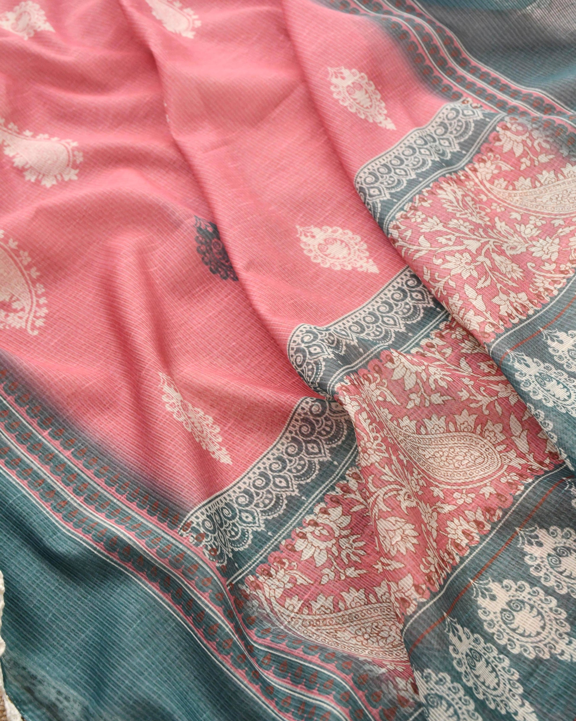 Designer Kota Doria Unstitched Suit Set – Floral Block Print with Elegant Crochet Lace