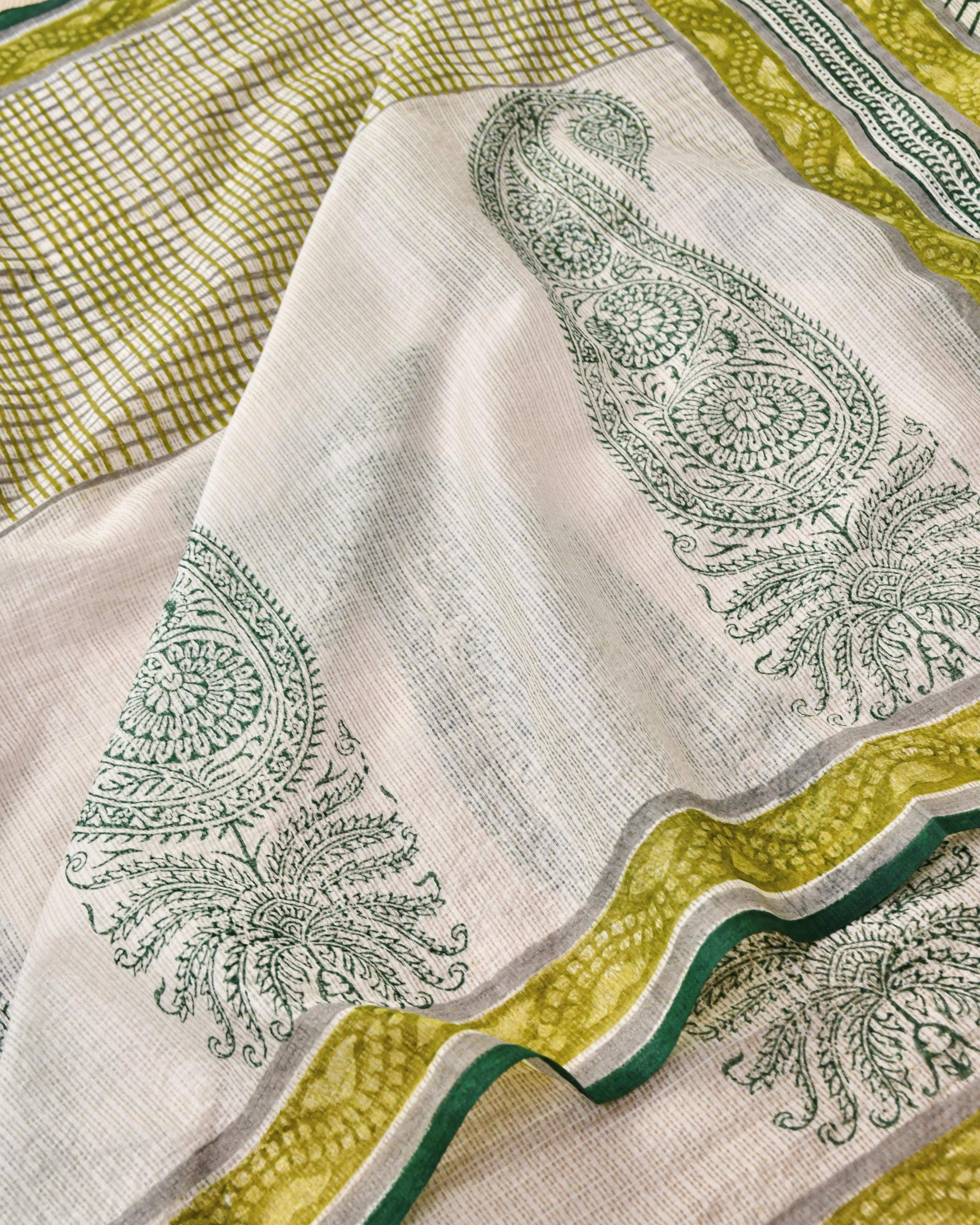 Dupatta -Lightweight Kota Doria dupatta adorned with classic Paisley motifs, geometric borders, and elegant tassels.