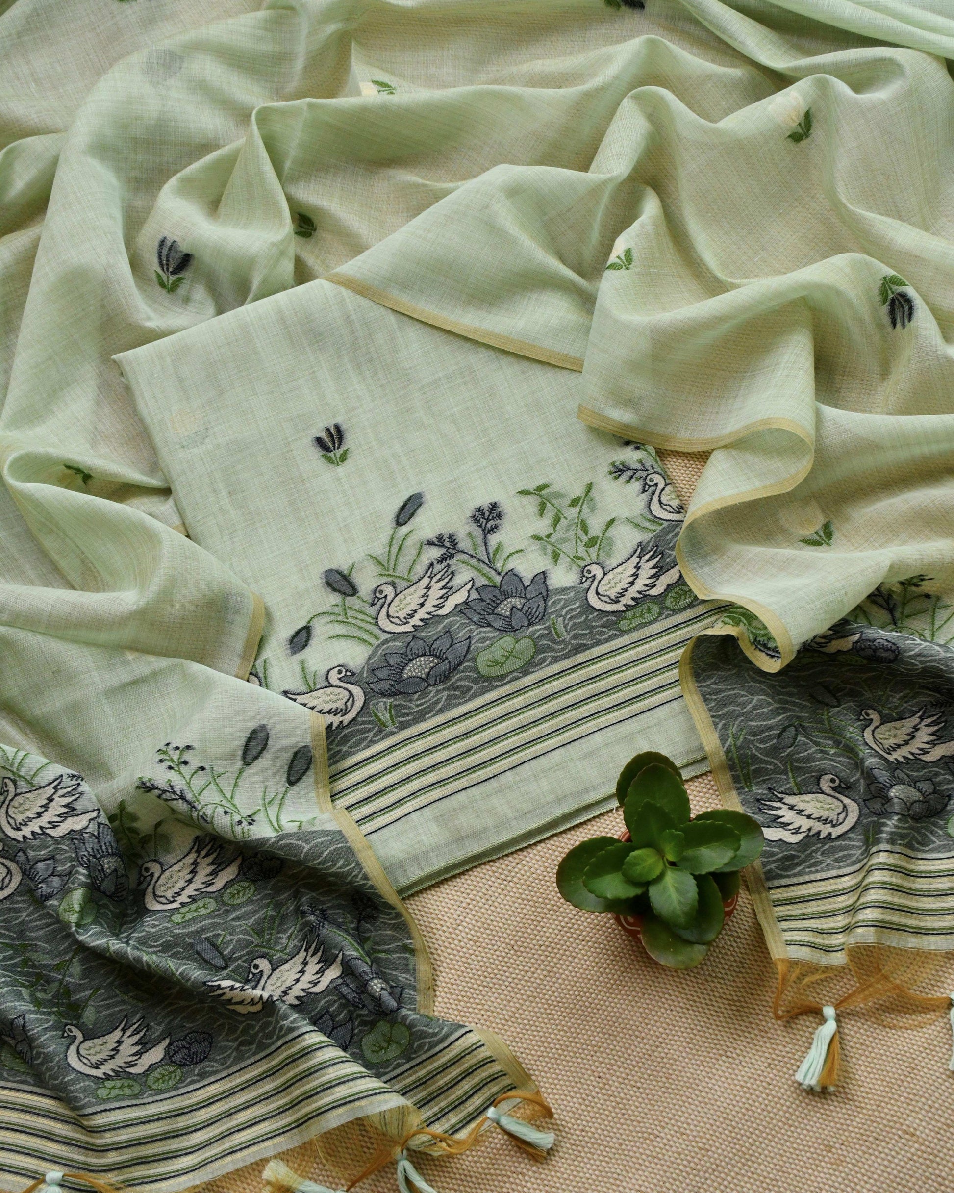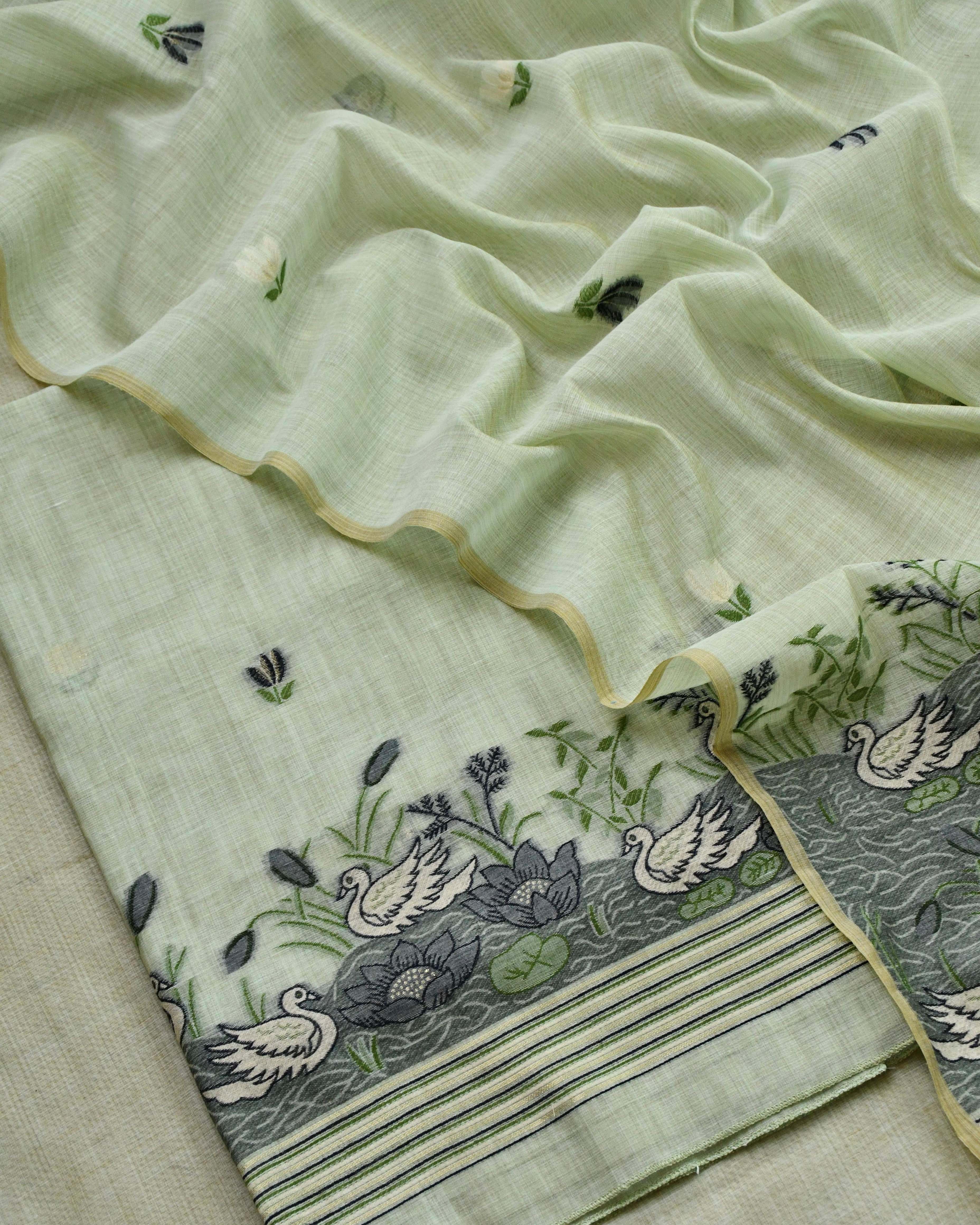 Our latest collection features a palette of ethereal pastel shades—from soft cream and powder blue to blush pink—perfect for summer soirées, formal office wear, or festive gatherings. Each set is a masterpiece of storytelling, featuring delicate floral and avian motifs (like the graceful swan and lotus) woven directly into the fabric using the traditional supplementary weft technique.