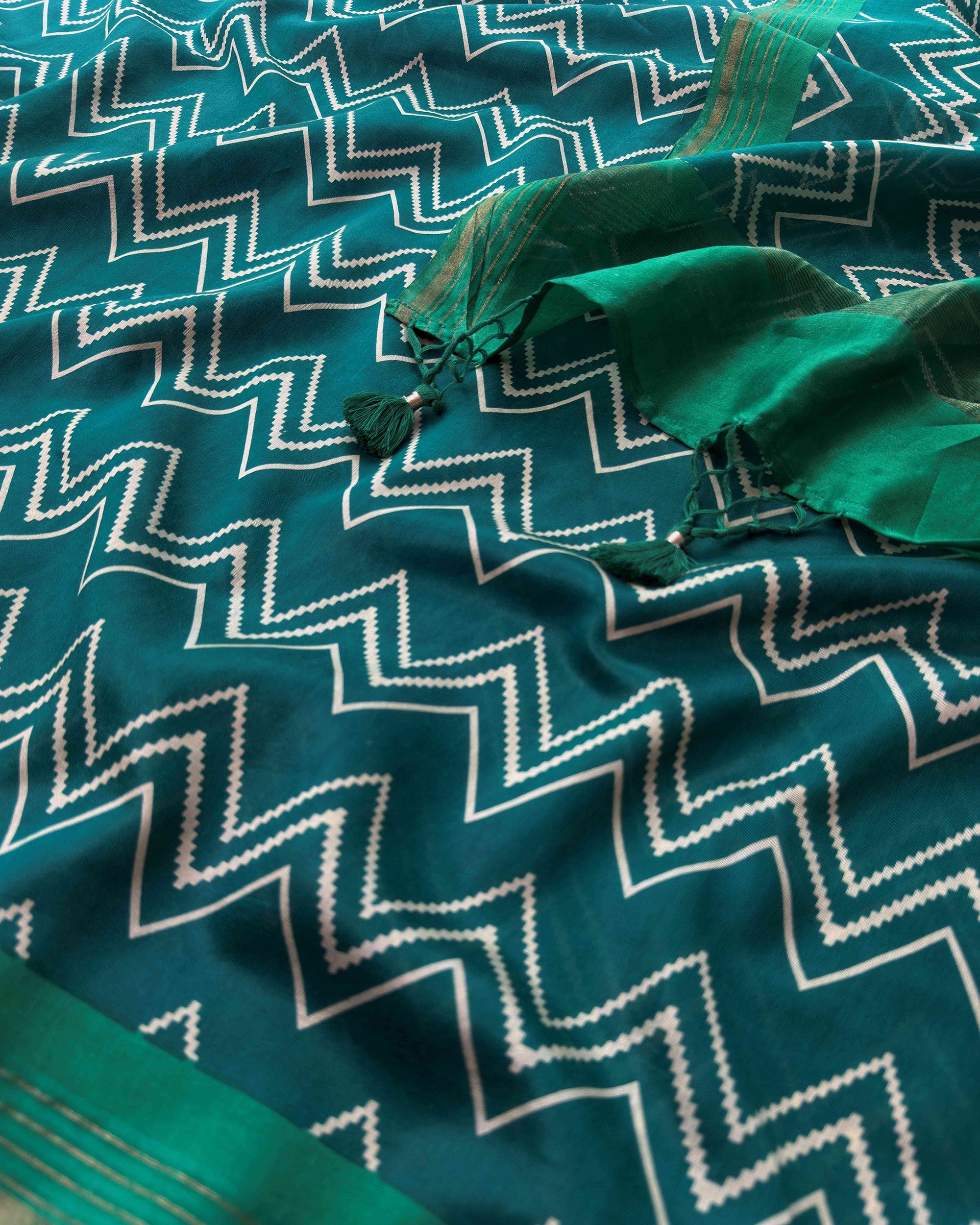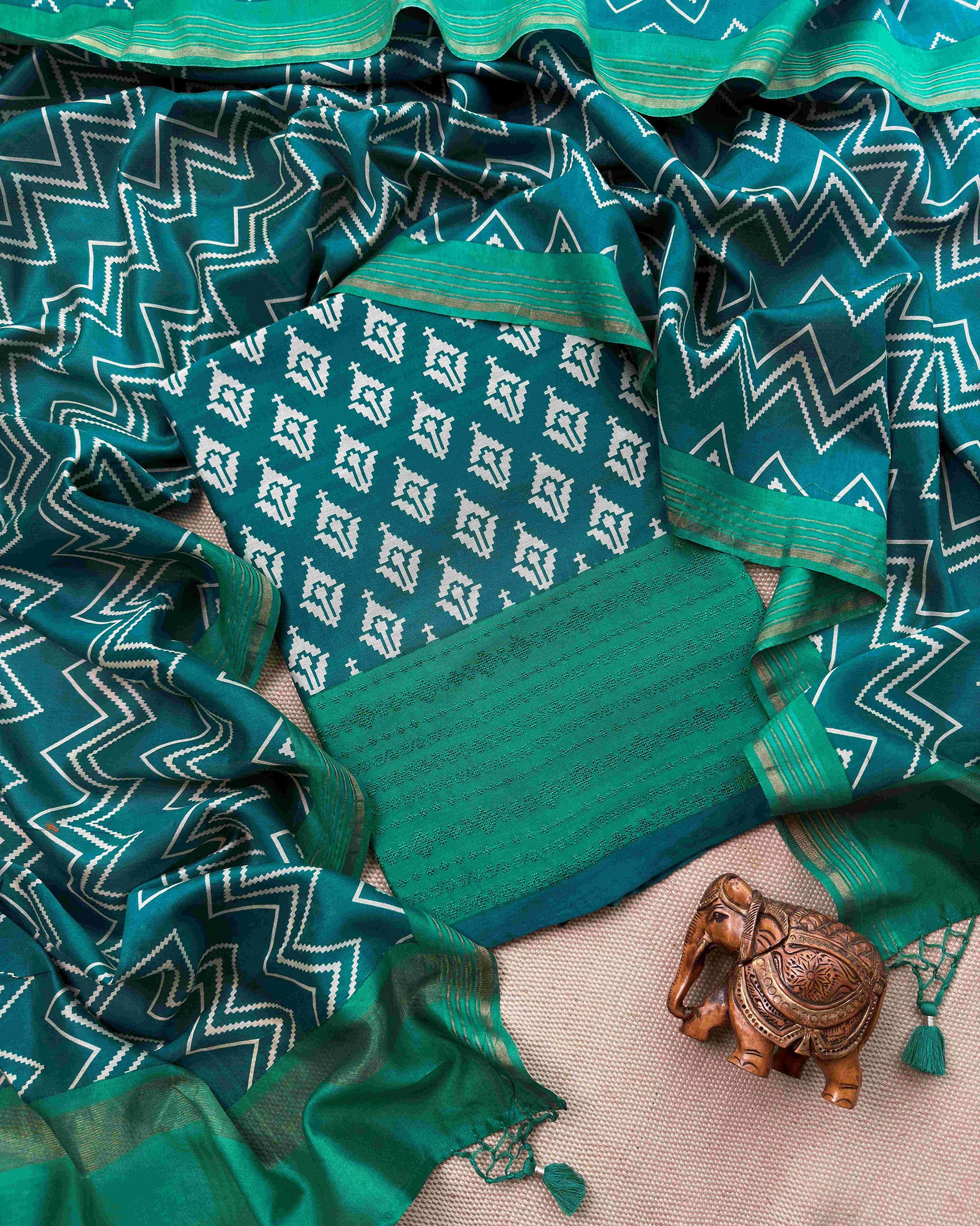 Forest Green Maheshwari Silk Unstitched Suit with Hand-Embroidered Accents