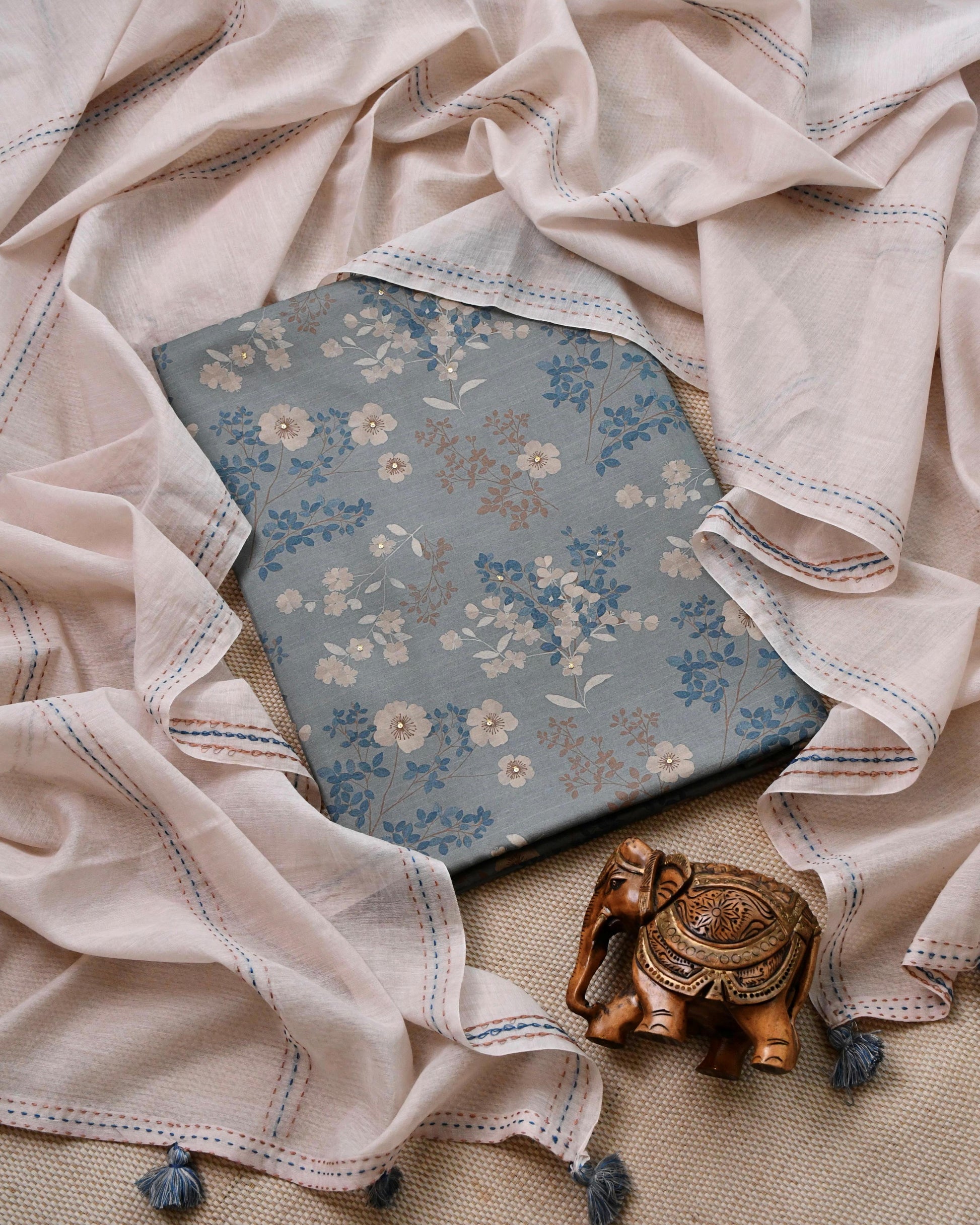Dupatta -Includes dupatta featuring Pure soft Banarasi Chanderi Silk Hand Kantha work Dupatta with hand-made Tassels