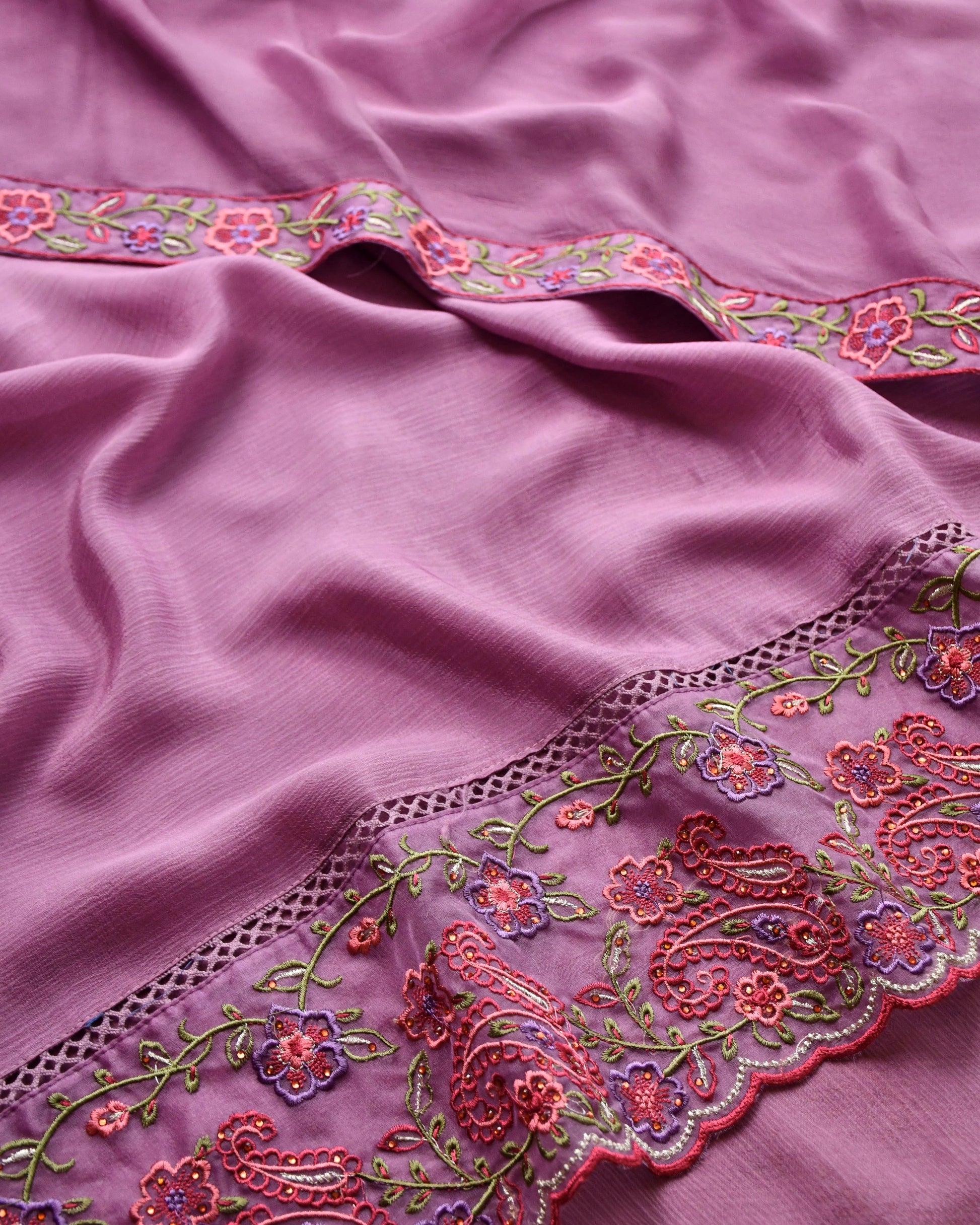 Ethereal Lavender-Pink Pure Crepe Unstitched Suit with Scalloped Embroidery