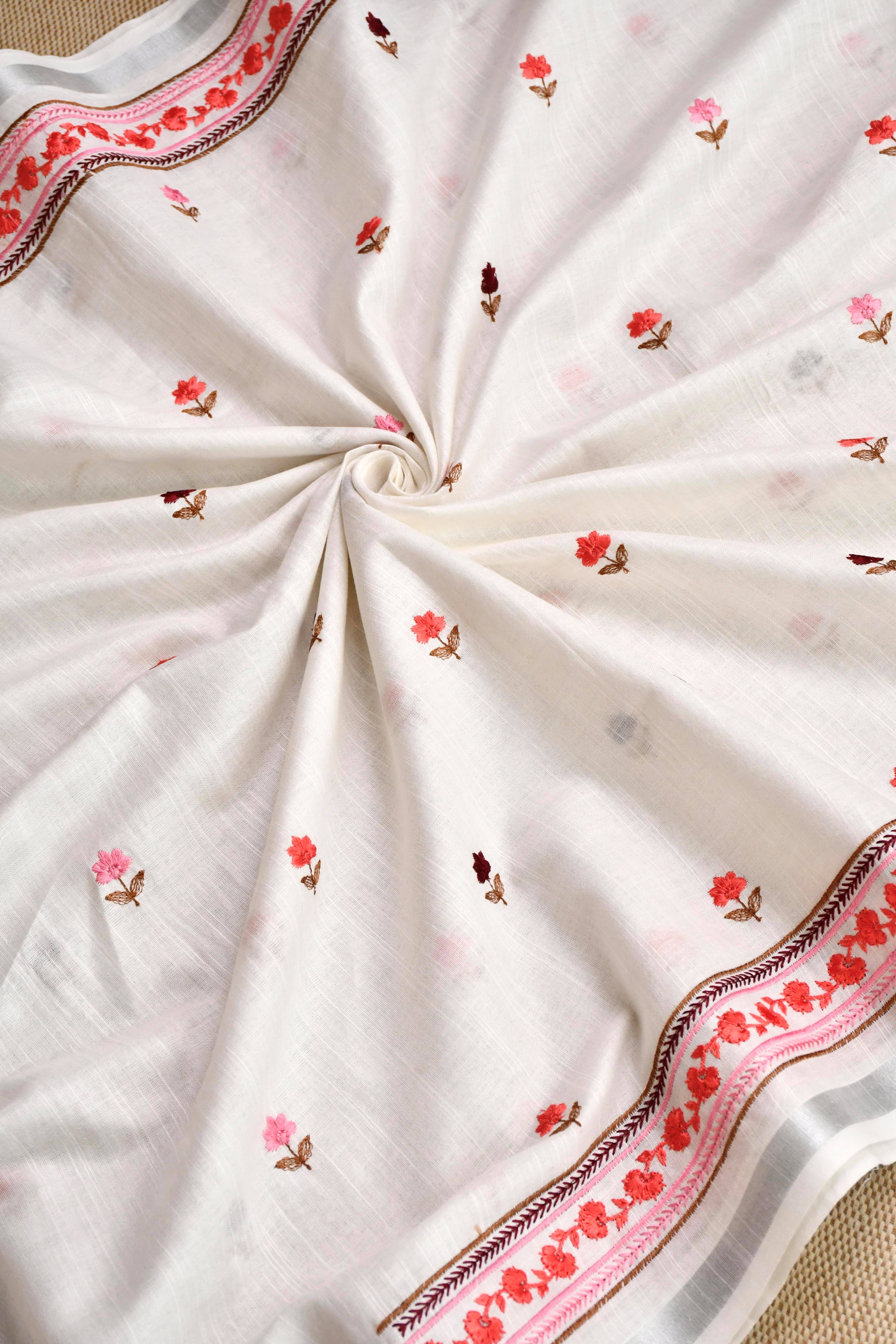 Dupatta -Includes a matching lightweight linen dupatta adorned with delicate floral "butis" and finished with elegant silver-threaded borders and tassel details..