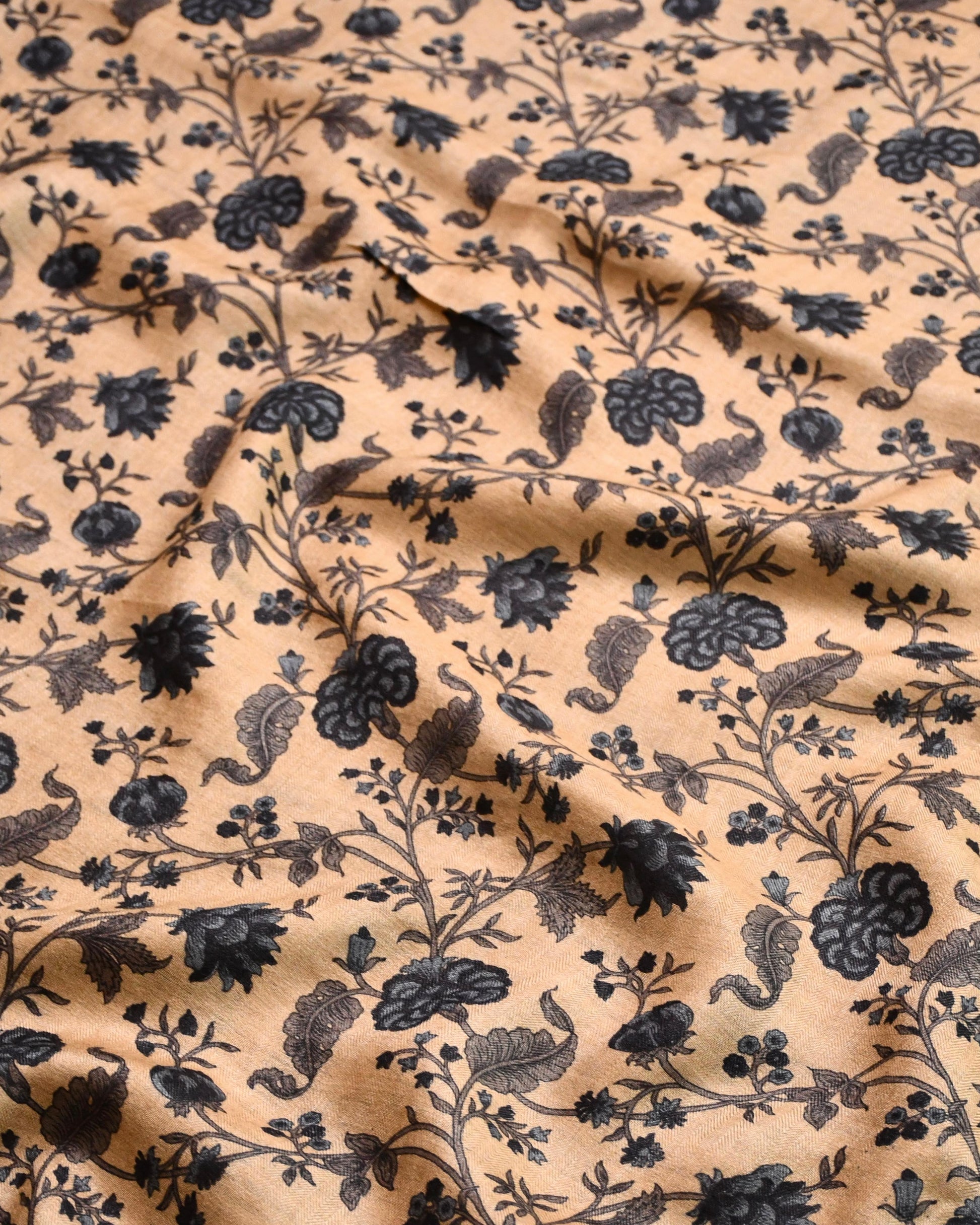 Top Fabric - Pure Pashmina Silk shirt with A warm beige base with subtle self-patterning, accented by a striking floral border.