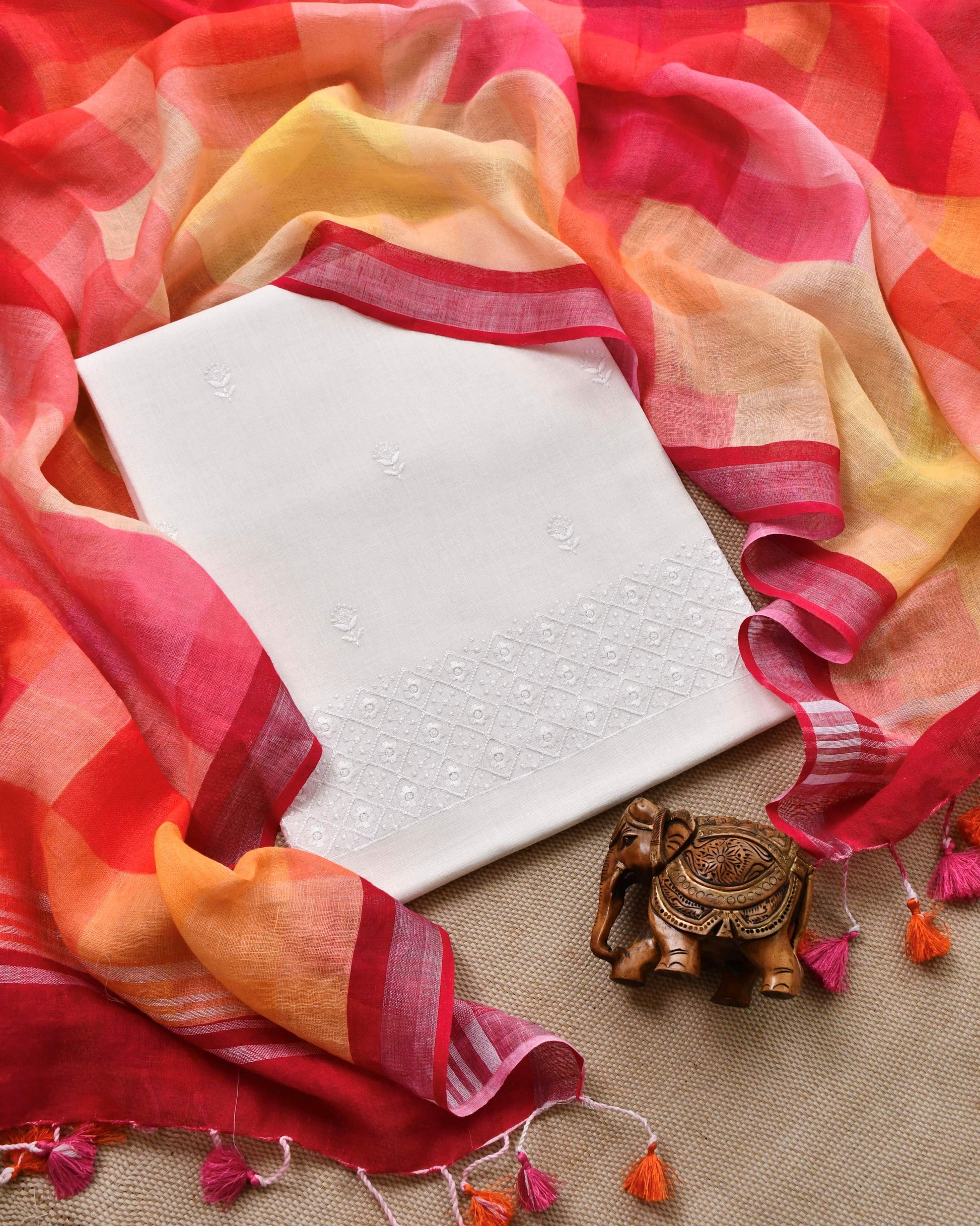 Pure White Linen Unstitched Suit with Sunset Checkered Linen Dupatta