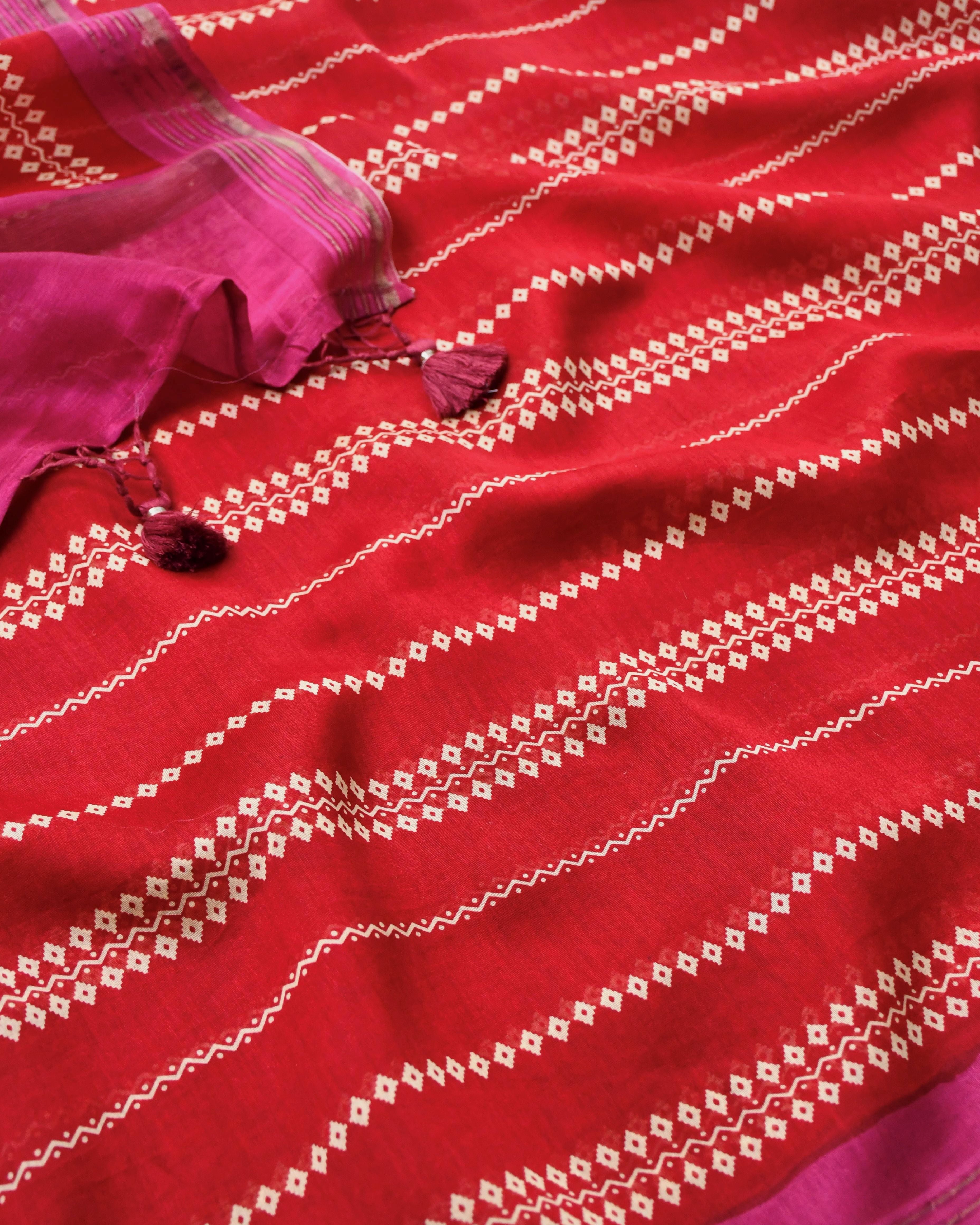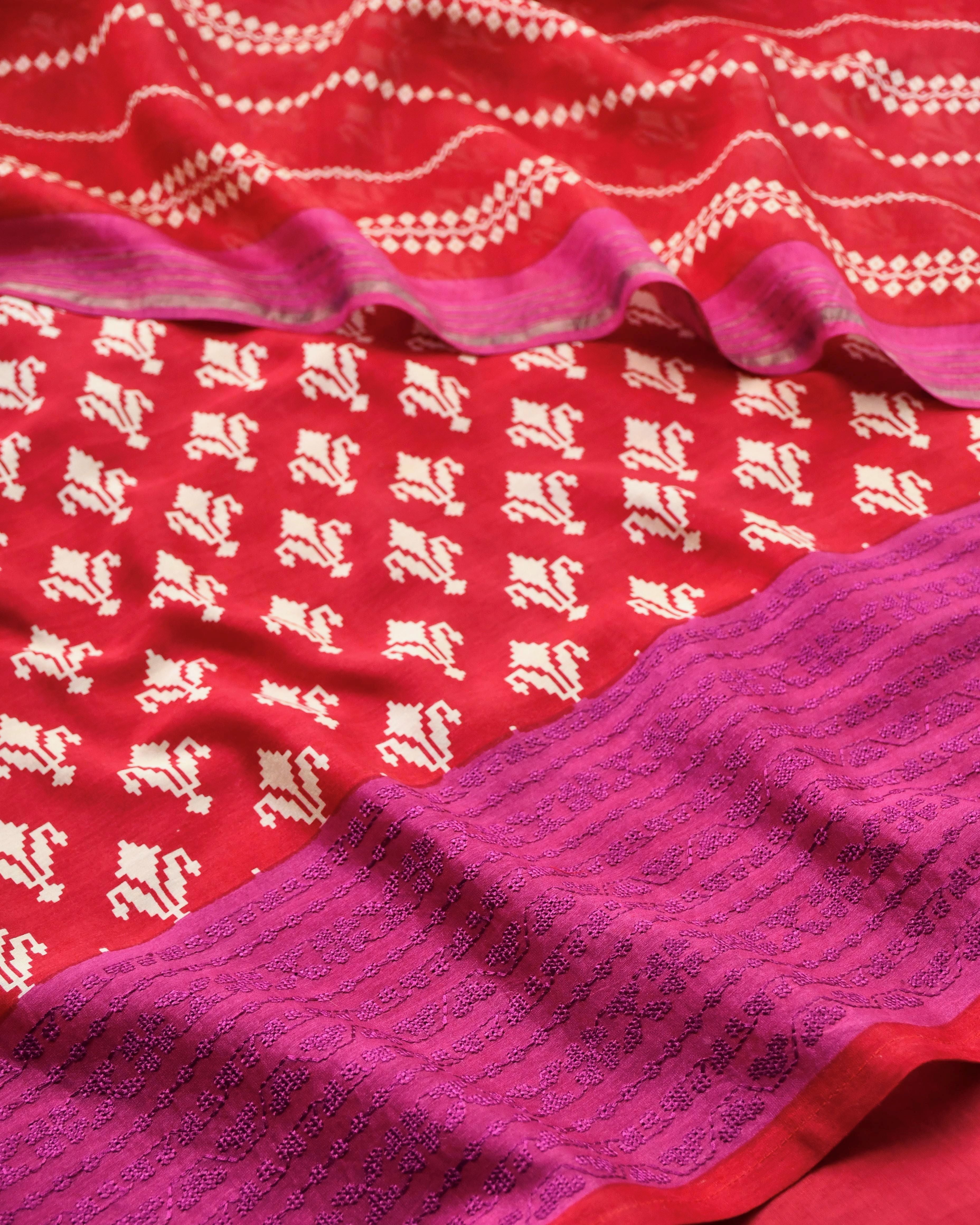 Red & Magenta Maheshwari Silk Unstitched Suit with Zari Border